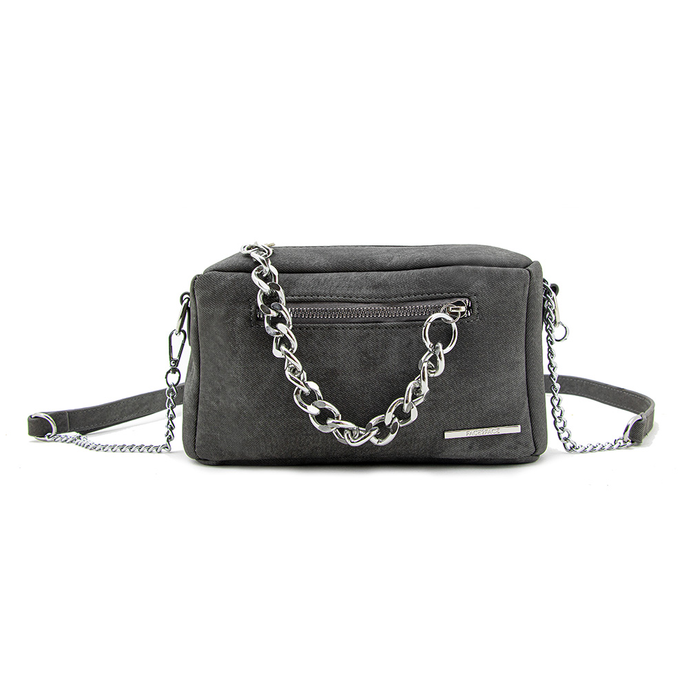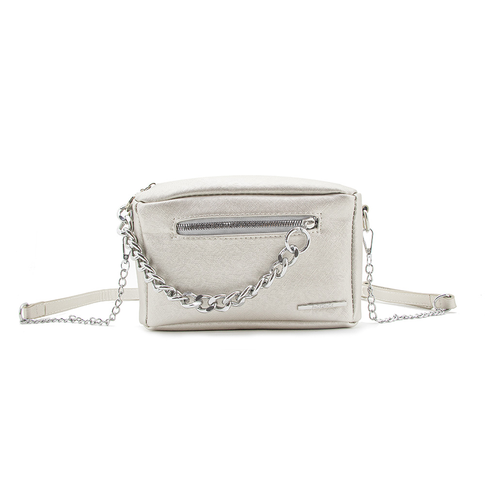 Bandolera rectangular con bolsillo delantero y cadena decorativa, bolsillo trasero con cierre y cargadera en sintético con cadena