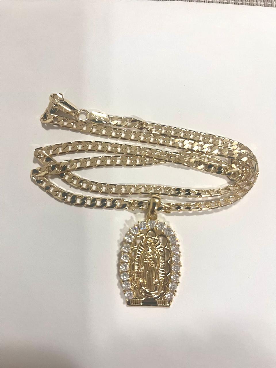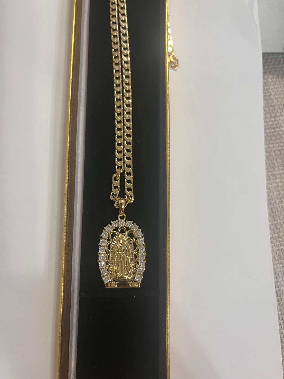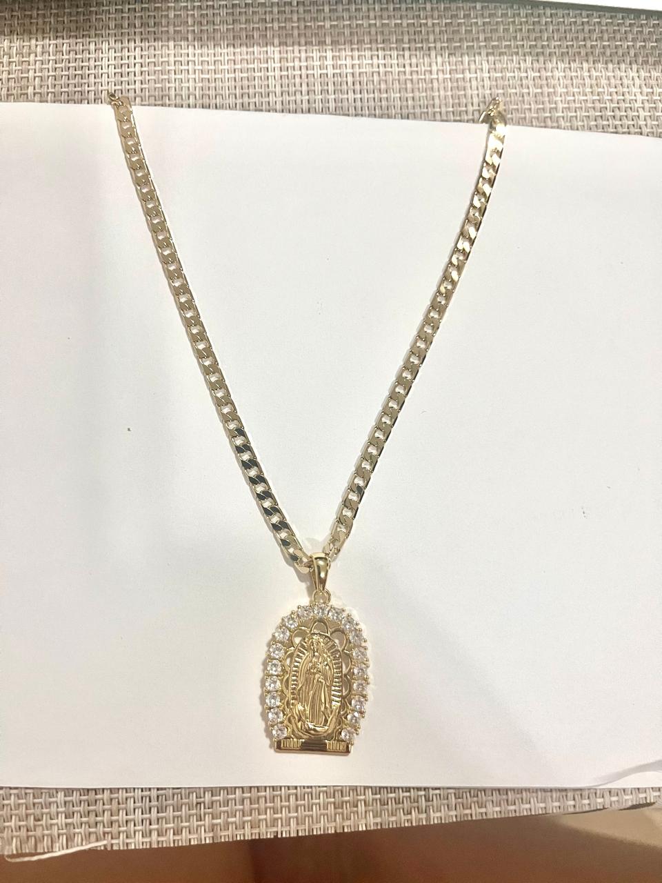 DIJE VIRGEN IMAGEN EN RELIEVE DORADO. SEMI OVALADO, ADORNADO CON PIEDRERIA BLANCA ALREDEDOR QUE ENBELLECEN LA PIEZA.