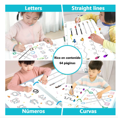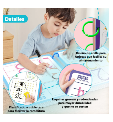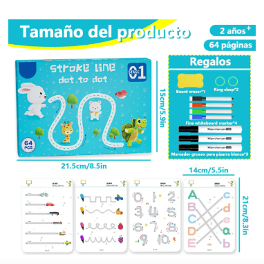 Los clientes pueden acceder a cuaderno magico de 64 páginas, 4 bolígrafos de pizarra blanca delgados, 3 bolígrafos de pizarra blanca gruesos, 1 borrador de pizarra blanca y 3 anillos de retención para satisfacer las necesidades de formación de los niños. El contenido del producto incluye ilustraciones encantadoras y contenidos interesantes como números y palabras, que pueden estimular el entusiasmo de los niños por el entrenamiento y mejorar su concentración y capacidad de lectura.