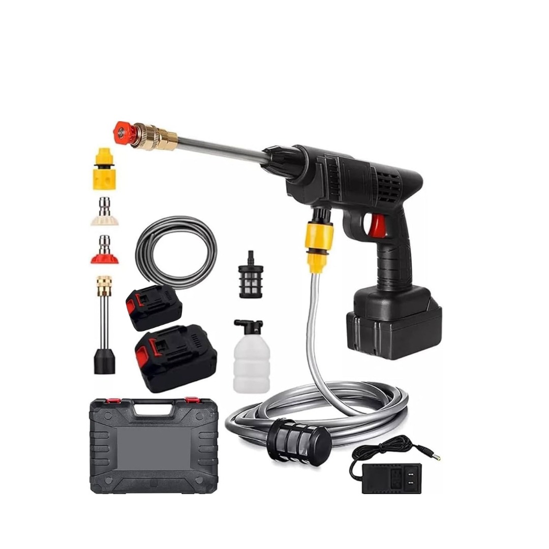 Incluye accesorios como una manguera de succión, un filtro, boquillas para diferentes tipos de chorro y un depósito para generar espuma. TAMBIEN INCLUYE DOS BATERIAS