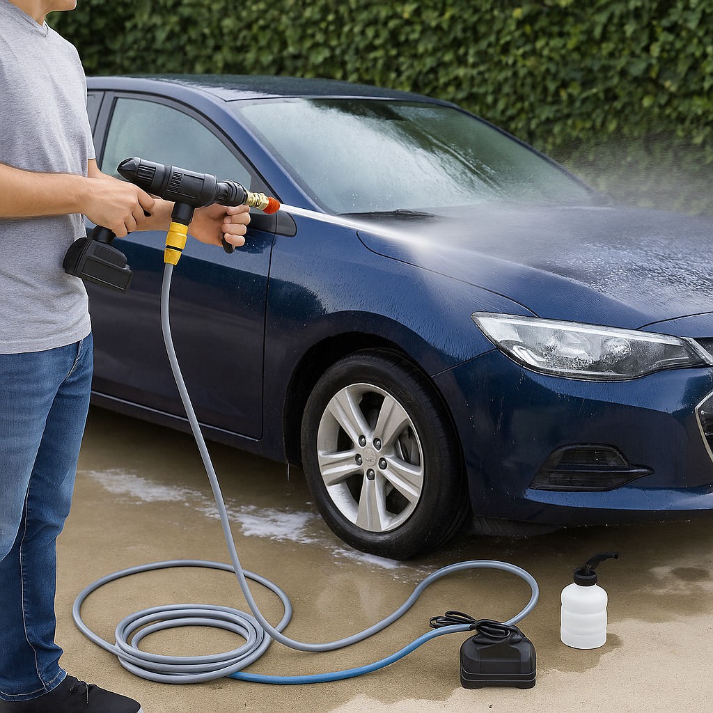Hidrolavadora portátil inalámbrica. Es una herramienta de limpieza que utiliza agua a alta presión para eliminar la suciedad de diversas superficies.