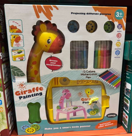 Este divertido set convierte el dibujo en una actividad mágica gracias a su adorable jirafa que proyecta diferentes patrones para que los niños puedan calcar, colorear y aprender mientras se divierten.