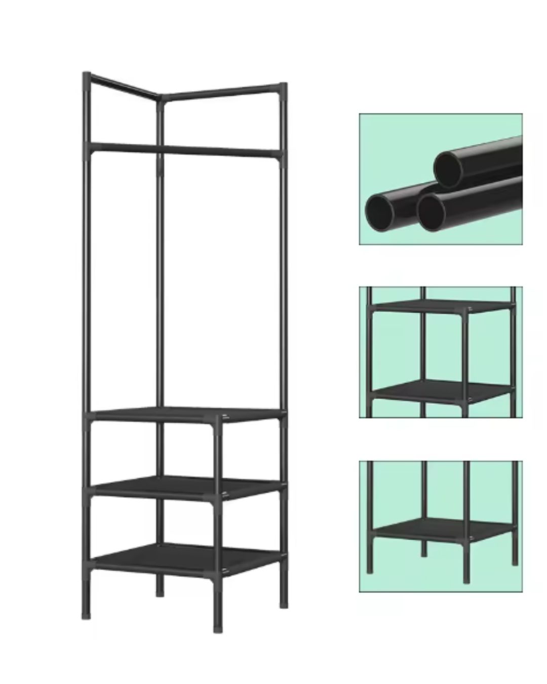 Ahorra espacio y es fácil de montar. No requiere herramientas ni tornillos; una sola persona puede montarlo en unos 5 minutos. Fabricado en tubo hueco, es ligero y resistente. Se puede guardar en esquinas o en la entrada, ahorrando espacio y haciéndolo ideal para vivir solo.