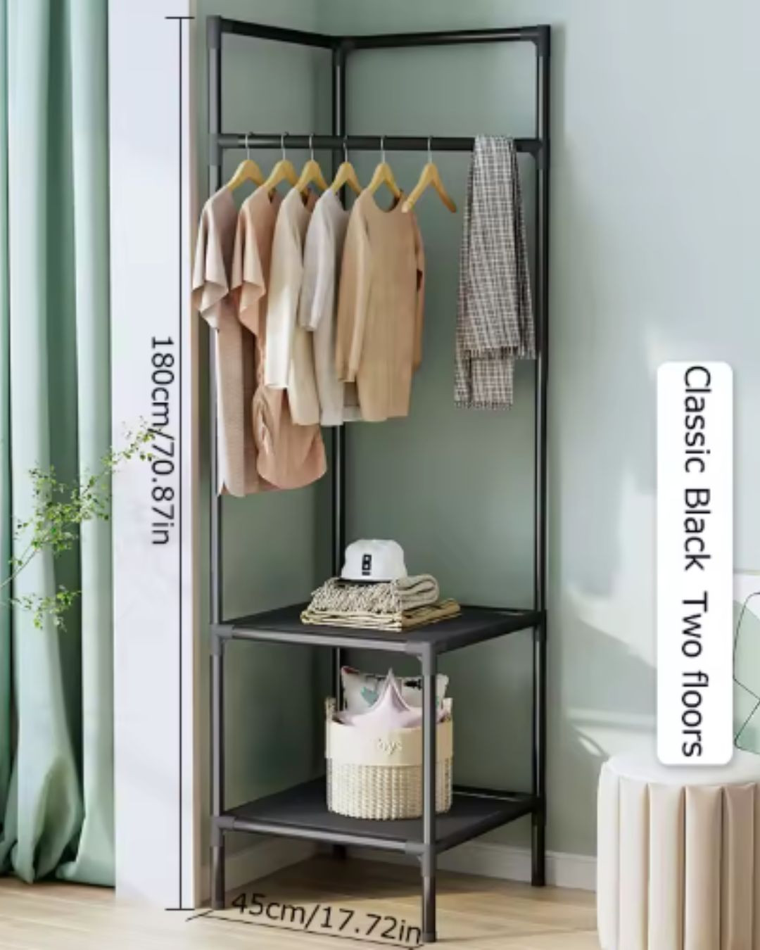Uso en esquina: Ancho 17.7 x Profundidad 17.7 x Altura 70.9 pulgadas (45 x 45 x 180 cm). El perchero abierto es de fácil acceso y se puede colocar en cualquier lugar. Mantén tu ropa organizada y ordenada cuando y donde quieras. Cada vez que organices tu ropa, tu estado de ánimo se verá mejor. Gracias a su diseño compacto, se puede colocar en la entrada, la sala, el dormitorio, el vestidor, etc.