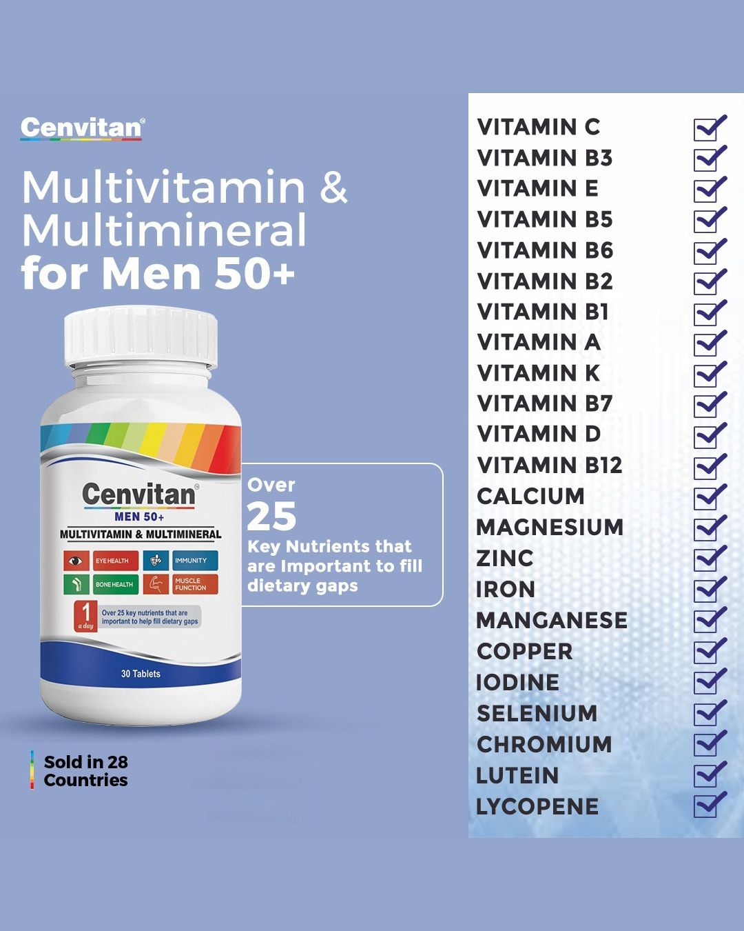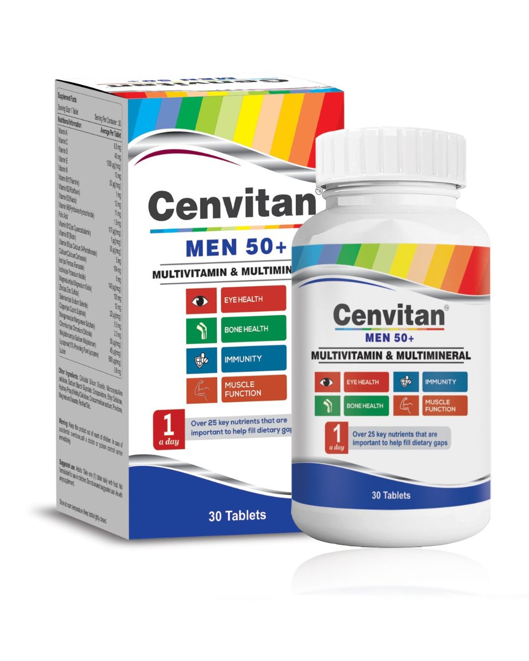 Cenvitan HOMBRE es un suplemento de multivitaminas y multiminerales diseñado para hombres, que apoya la energía, la inmunidad, el metabolismo y una apariencia saludable con más de 26 nutrientes esenciales. Cenvitan HOMBRE está formulado con vitaminas y minerales para ayudar a mejorar la salud integral masculina, incluyendo el sistema digestivo, el corazón, la visión, el cerebro y el bienestar general. Este suplemento multivitamínico