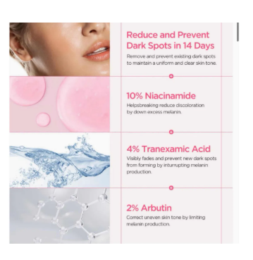 Sérum formulado con un 10% de Niacinamida, 4% de Ácido Tranexámico y 2% de Arbutina, ideal para quienes desean aclarar todo tipo de manchas y unificar el tono de la piel, logrando una piel hidratada y luminosa.