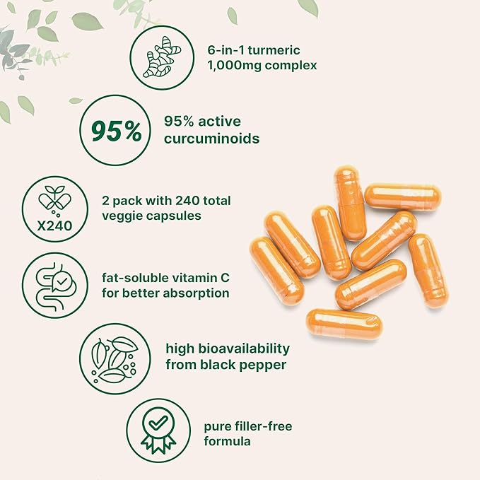 ofrece un complejo de curcumina de cúrcuma pura 6 en 1 de 1,000 mg. Un potente extracto de raíz de cúrcuma con un 95% de curcuminoides activos. 120 cápsulas vegetales que cuentan con ingredientes activos crudos sin rellenos.